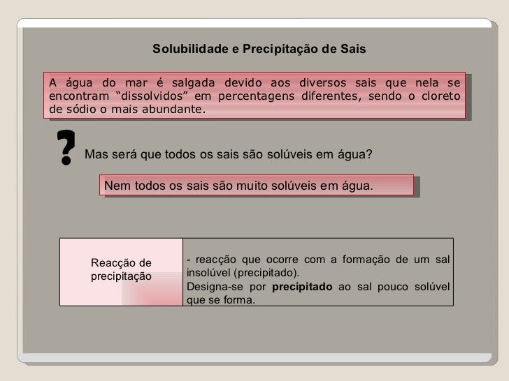 35. 36. A água do mar é salgada devido aos diversos sais que nela se encontram “dissolvidos” em percentagens diferentes, sendo o cloreto de sódio o mais abundante. Solubilidade e Precipitação de Sais Nem todos os sais são muito solúveis em água. Mas será que todos os sais são solúveis em água? ? Reacção de precipitação - reacção que ocorre com a formação de um sal insolúvel (precipitado). Designa-se por precipitado ao sal pouco solúvel que se forma.