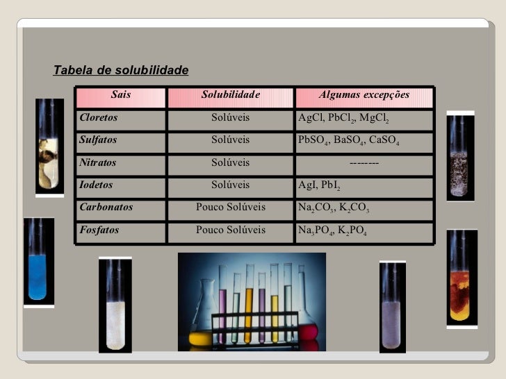 36. 37. Tabela de solubilidade Sais Solubilidade Algumas excepções Cloretos Solúveis AgCl, PbCl 2 , MgCl 2 Sulfatos Solúveis PbSO 4 , BaSO 4 , CaSO 4 Nitratos Solúveis -------- Iodetos Solúveis AgI, PbI 2 Carbonatos Pouco Solúveis Na 2 CO 3 , K 2 CO 3 Fosfatos Pouco Solúveis Na 3 PO 4 , K 2 PO 4