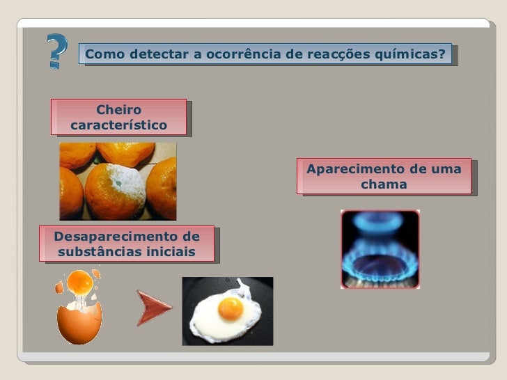 3. 4. Cheiro característico Aparecimento de uma chama Desaparecimento de substâncias iniciais Como detectar a ocorrência de reacções químicas?