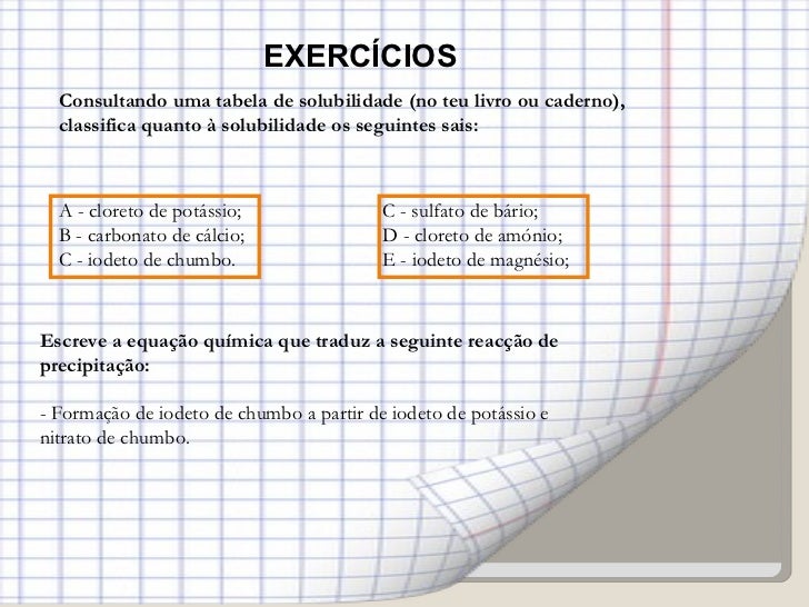 41. 43. EXERCÍCIOS Consultando uma tabela de solubilidade (no teu livro ou caderno), classifica quanto à solubilidade os seguintes sais: A - cloreto de potássio; C - sulfato de bário; B - carbonato de cálcio; D - cloreto de amónio; C - iodeto de chumbo. E - iodeto de magnésio; Escreve a equação química que traduz a seguinte reacção de precipitação: - Formação de iodeto de chumbo a partir de iodeto de potássio e nitrato de chumbo.
