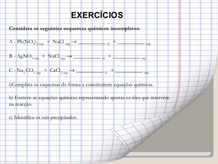 42. 44. <ul><li>Considera os seguintes esquemas químicos incompletos: </li></ul><ul><li>A - Pb(NO 3 ) 2 (aq) + NaCl (aq)  __________ (s) + __________ (aq) </li></ul><ul><li>B - AgNO 3 (aq) + NaCl (aq)  __________ (s) + __________ (aq) </li></ul><ul><li>C - Na 2 CO 3 (aq) + CaCl 2 (aq)  __________ (s) + __________ (aq) </li></ul><ul><li>Completa os esquemas de forma a constituírem equações químicas. </li></ul><ul><li>b) Escreve as equações químicas representando apenas os iões que intervêm na reacção. </li></ul><ul><li>c) Identifica os sais precipitados. </li></ul>EXERCÍCIOS