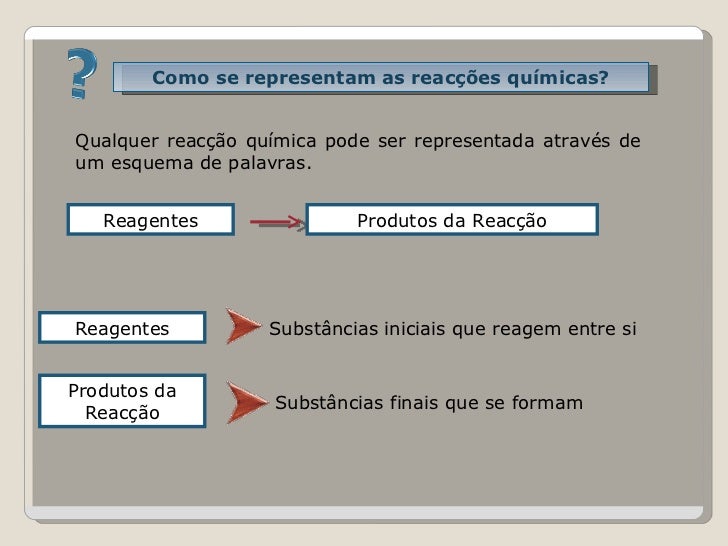 4. 5. Qualquer reacção química pode ser representada através de um esquema de palavras. Reagentes Produtos da Reacção Reagentes Produtos da Reacção Substâncias iniciais que reagem entre si Substâncias finais que se formam Como se representam as reacções químicas?