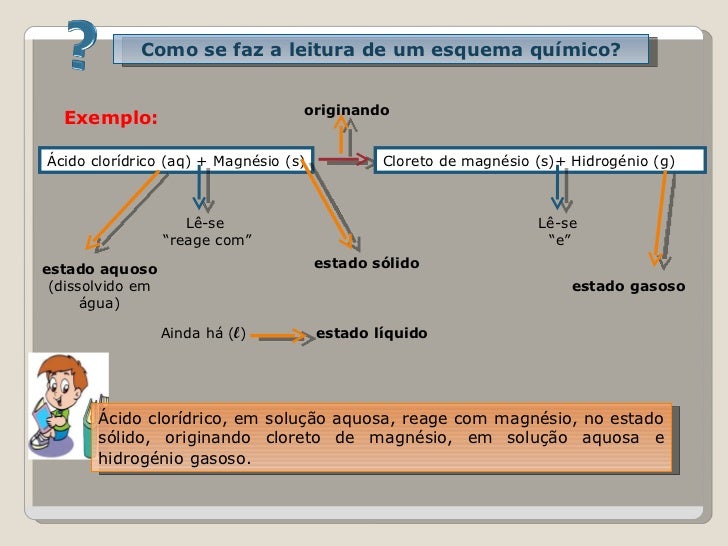 5. 6. originando Ácido clorídrico, em solução aquosa, reage com magnésio, no estado sólido, originando cloreto de magnésio, em solução aquosa e hidrogénio gasoso. Como se faz a leitura de um esquema químico? Exemplo: Ácido clorídrico (aq) + Magnésio (s) Cloreto de magnésio (s)+ Hidrogénio (g) Lê-se “ reage com” Lê-se “ e” estado aquoso (dissolvido em água) estado sólido estado gasoso Ainda há ( l ) estado líquido