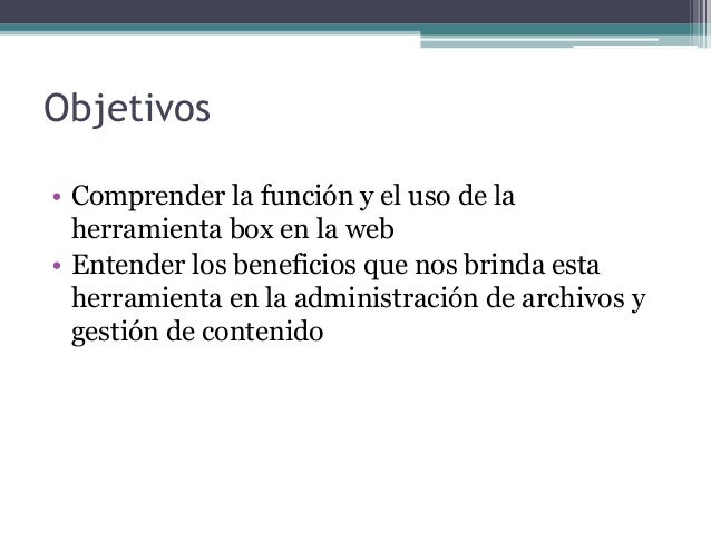 1. 1. Objetivos• Comprender la función y el uso de laherramienta box en la web• Entender los beneficios que nos brinda estaherramienta en la administración de archivos ygestión de contenido