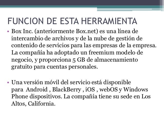 2. 2. FUNCION DE ESTA HERRAMIENTA• Box Inc. (anteriormente Box.net) es una línea deintercambio de archivos y de la nube de gestión decontenido de servicios para las empresas de la empresa.La compañía ha adoptado un freemium modelo denegocio, y proporciona 5 GB de almacenamientogratuito para cuentas personales.• Una versión móvil del servicio está disponiblepara Android , BlackBerry , iOS , webOS y WindowsPhone dispositivos. La compañía tiene su sede en LosAltos, California.