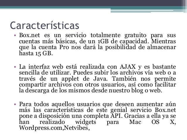 3. 3. Características• Box.net es un servicio totalmente gratuito para suscuentas más básicas, de un 1GB de capacidad. Mientrasque la cuenta Pro nos dará la posibilidad de almacenarhasta 15 GB.• La interfaz web está realizada con AJAX y es bastantesencilla de utilizar. Puedes subir los archivos vía web o através de un applet de Java. También nos permitecompartir archivos con otros usuarios, así como facilitarla descarga de los mismos desde nuestro blog o web.• Para todos aquellos usuarios que deseen aumentar aúnmás las características de este genial servicio Box.netpone a disposición una completa API. Gracias a ella ya sehan realizado widgets para Mac OS X,Wordpress.com,Netvibes,