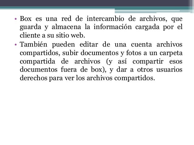 4. 4. • Box es una red de intercambio de archivos, queguarda y almacena la información cargada por elcliente a su sitio web.• También pueden editar de una cuenta archivoscompartidos, subir documentos y fotos a un carpetacompartida de archivos (y así compartir esosdocumentos fuera de box), y dar a otros usuariosderechos para ver los archivos compartidos.