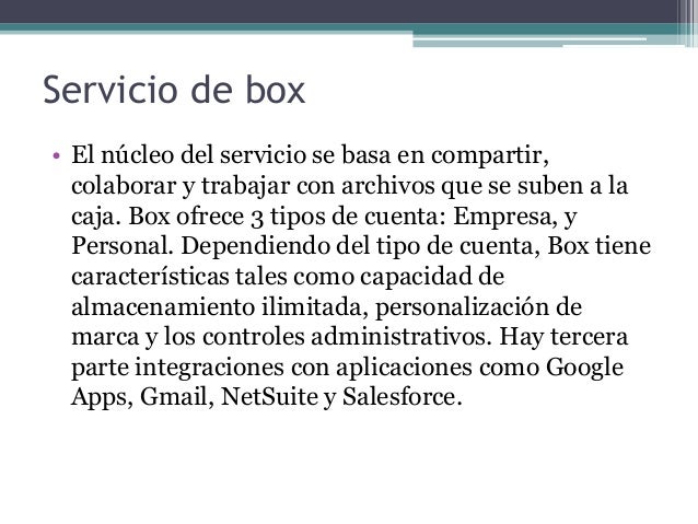5. 5. Servicio de box• El núcleo del servicio se basa en compartir,colaborar y trabajar con archivos que se suben a lacaja. Box ofrece 3 tipos de cuenta: Empresa, yPersonal. Dependiendo del tipo de cuenta, Box tienecaracterísticas tales como capacidad dealmacenamiento ilimitada, personalización demarca y los controles administrativos. Hay terceraparte integraciones con aplicaciones como GoogleApps, Gmail, NetSuite y Salesforce.