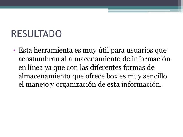6. 6. RESULTADO• Esta herramienta es muy útil para usuarios queacostumbran al almacenamiento de informaciónen línea ya que con las diferentes formas dealmacenamiento que ofrece box es muy sencilloel manejo y organización de esta información.