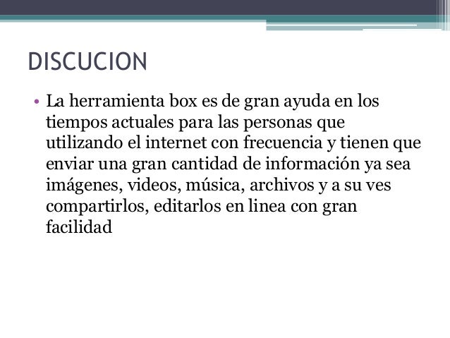 7. 7. DISCUCION• La herramienta box es de gran ayuda en lostiempos actuales para las personas queutilizando el internet con frecuencia y tienen queenviar una gran cantidad de información ya seaimágenes, videos, música, archivos y a su vescompartirlos, editarlos en linea con granfacilidad