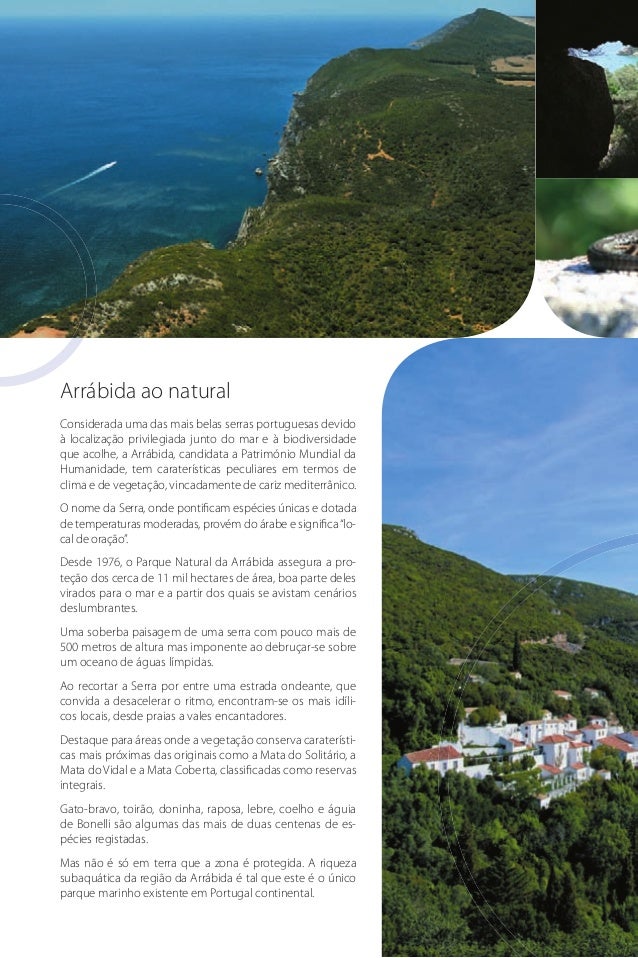 7. 7. Arrábida ao natural Considerada uma das mais belas serras portuguesas devido à localização privilegiada junto do mar e à biodiversidade que acolhe, a Arrábida, candidata a Património Mundial da Humanidade, tem caraterísticas peculiares em termos de clima e de vegetação, vincadamente de cariz mediterrânico. O nome da Serra, onde pontificam espécies únicas e dotada de temperaturas moderadas, provém do árabe e significa “local de oração”. Desde 1976, o Parque Natural da Arrábida assegura a proteção dos cerca de 11 mil hectares de área, boa parte deles virados para o mar e a partir dos quais se avistam cenários deslumbrantes. Uma soberba paisagem de uma serra com pouco mais de 500 metros de altura mas imponente ao debruçar-se sobre um oceano de águas límpidas. Ao recortar a Serra por entre uma estrada ondeante, que convida a desacelerar o ritmo, encontram-se os mais idílicos locais, desde praias a vales encantadores. Destaque para áreas onde a vegetação conserva caraterísticas mais próximas das originais como a Mata do Solitário, a Mata do Vidal e a Mata Coberta, classificadas como reservas integrais. Gato-bravo, toirão, doninha, raposa, lebre, coelho e águia de Bonelli são algumas das mais de duas centenas de espécies registadas. Mas não é só em terra que a zona é protegida. A riqueza subaquática da região da Arrábida é tal que este é o único parque marinho existente em Portugal continental.