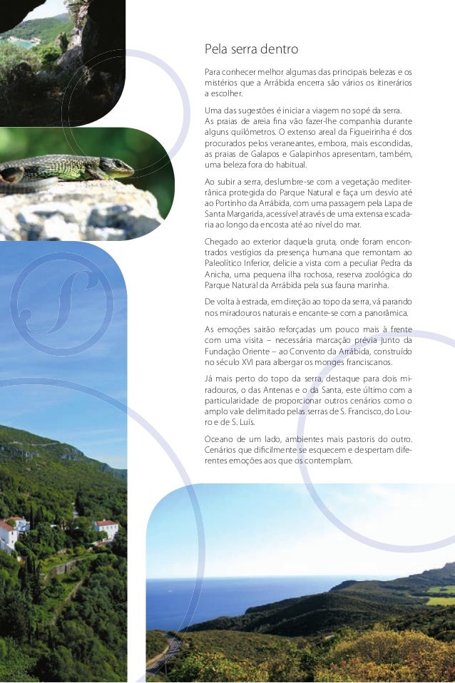8. 8. Pela serra dentro Para conhecer melhor algumas das principais belezas e os mistérios que a Arrábida encerra são vários os itinerários a escolher. Uma das sugestões é iniciar a viagem no sopé da serra. As praias de areia fina vão fazer-lhe companhia durante alguns quilómetros. O extenso areal da Figueirinha é dos procurados pelos veraneantes, embora, mais escondidas, as praias de Galapos e Galapinhos apresentam, também, uma beleza fora do habitual. Ao subir a serra, deslumbre-se com a vegetação mediterrânica protegida do Parque Natural e faça um desvio até ao Portinho da Arrábida, com uma passagem pela Lapa de Santa Margarida, acessível através de uma extensa escadaria ao longo da encosta até ao nível do mar. Chegado ao exterior daquela gruta, onde foram encontrados vestígios da presença humana que remontam ao Paleolítico Inferior, delicie a vista com a peculiar Pedra da Anicha, uma pequena ilha rochosa, reserva zoológica do Parque Natural da Arrábida pela sua fauna marinha. De volta à estrada, em direção ao topo da serra, vá parando nos miradouros naturais e encante-se com a panorâmica. As emoções sairão reforçadas um pouco mais à frente com uma visita – necessária marcação prévia junto da Fundação Oriente – ao Convento da Arrábida, construído no século XVI para albergar os monges franciscanos. mi Já mais perto do topo da serra, destaque para dois miradouros, o das Antenas e o da Santa, este último com a particularidade de proporcionar outros cenários como o Lou amplo vale delimitado pelas serras de S. Francisco, do Louro e de S. Luís. Oceano de um lado, ambientes mais pastoris do outro. dife Cenários que dificilmente se esquecem e despertam diferentes emoções aos que os contemplam.