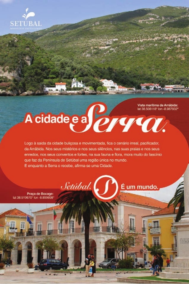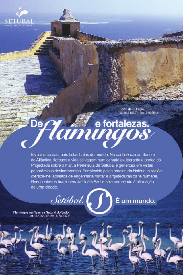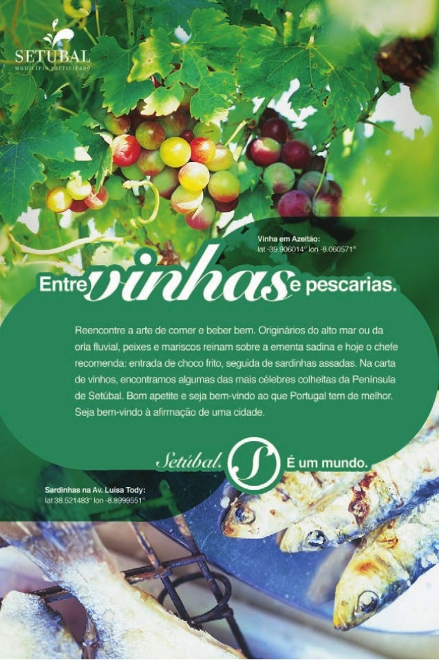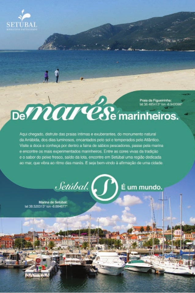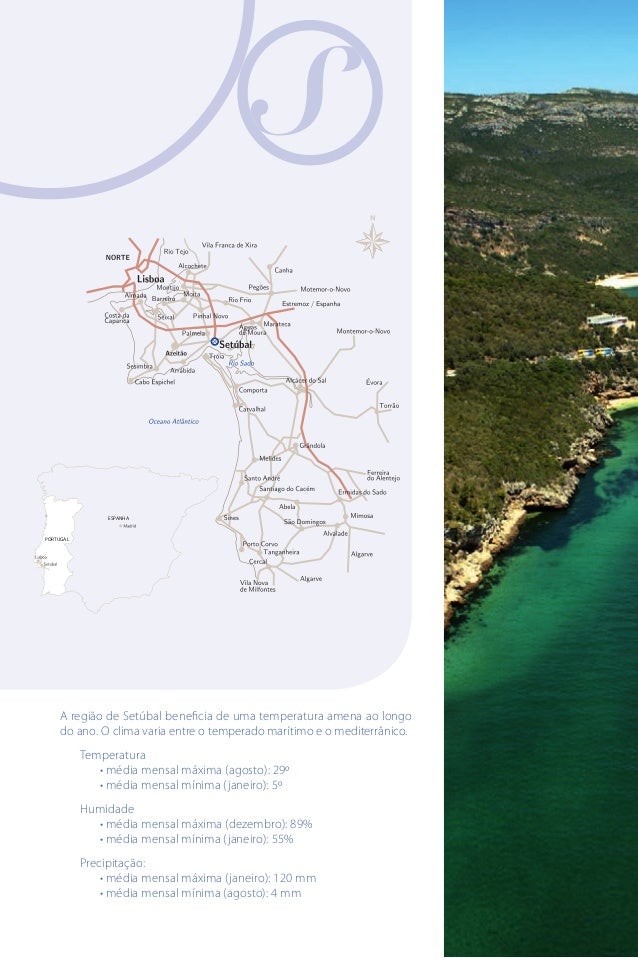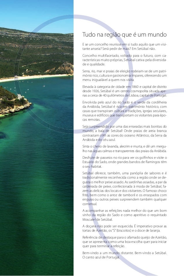 2. 2. Tudo na região que é um mundo E se um concelho reunisse em si tudo aquilo que um visivisi tante anseia? Será pedir de mais? Em Setúbal não. ca Concelho multifacetado, voltado para o futuro, com cadiversida racterísticas muito próprias, Setúbal cativa pela diversidade e qualidade. patri Serra, rio, mar e praias de eleição rodeiam-se de um património rico, cultura e gastronomia ímpares, oferecendo um menu inigualável a quem nos visita. Elevada à categoria de cidade em 1860 e capital de distrito ape desde 1926, Setúbal é um centro cosmopolita situada apenas a cerca de 40 quilómetros de Lisboa, capital de Portugal. Envolvida pelo azul do rio Sado e o verde da cordilheira da Arrábida, Setúbal é rica em património histórico, com casas que transpiram cultura e tradições, igrejas seculares, épo museus e edifícios que transportam os visitantes para épocas remotas. Seja surpreendido por uma das enseadas mais bonitas do mundo, a baía de Setúbal! Onde praias de areia branca contrastam com as cores do oceano Atlântico, da Serra da Arrábida e do céu azul. mergu Sinta o cheiro de lavanda, alecrim e murta, e dê um mergulho nas águas calmas e transparentes das praias da Arrábida. Desfrute de passeios no rio para ver os golfinhos e visite o Estuário do Sado, onde grandes bandos de flamingos têm o seu habitat. Setúbal oferece, também, uma panóplia de sabores e é de tradicionalmente reconhecida como a região onde se degusta o melhor peixe assado. As sardinhas assadas, a par da fa caldeirada de peixe, confecionada à moda de Setúbal, fazem as delícias dos locais e dos visitantes. O famoso choco frito, bem como o arroz de tamboril e os ensopados com enguias ou outros peixes surpreendem também qualquer comensal. A acompanhar as refeições nada melhor do que um bom vinho da região do Sado e como aperitivo o requintado Moscatel de Setúbal. A doçaria não pode ser esquecida. É imperativo provar as tortas de Azeitão, os “S” (biscoitos) e o doce de laranja. Referência de destaque para o afamado queijo de Azeitão, que se apresenta como uma boa escolha quer para iniciar quer para terminar a refeição. Bem-vindo a um mundo distante. Bem-vindo a Setúbal. O canto azul de Portugal.