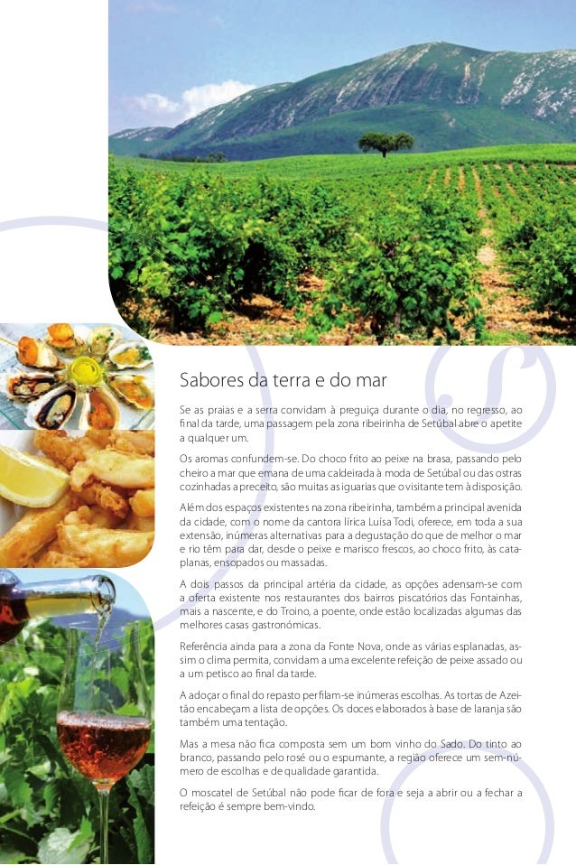 9. 9. Sabores da terra e do mar Se as praias e a serra convidam à preguiça durante o dia, no regresso, ao final da tarde, uma passagem pela zona ribeirinha de Setúbal abre o apetite a qualquer um. Os aromas confundem-se. Do choco frito ao peixe na brasa, passando pelo cheiro a mar que emana de uma caldeirada à moda de Setúbal ou das ostras cozinhadas a preceito, são muitas as iguarias que o visitante tem à disposição. Além dos espaços existentes na zona ribeirinha, também a principal avenida da cidade, com o nome da cantora lírica Luísa Todi, oferece, em toda a sua extensão, inúmeras alternativas para a degustação do que de melhor o mar cata e rio têm para dar, desde o peixe e marisco frescos, ao choco frito, às cataplanas, ensopados ou massadas. A dois passos da principal artéria da cidade, as opções adensam-se com a oferta existente nos restaurantes dos bairros piscatórios das Fontainhas, mais a nascente, e do Troino, a poente, onde estão localizadas algumas das melhores casas gastronómicas. Referência ainda para a zona da Fonte Nova, onde as várias esplanadas, assim o clima permita, convidam a uma excelente refeição de peixe assado ou a um petisco ao final da tarde. A adoçar o final do repasto perfilam-se inúmeras escolhas. As tortas de Azeitão encabeçam a lista de opções. Os doces elaborados à base de laranja são também uma tentação. Mas a mesa não fica composta sem um bom vinho do Sado. Do tinto ao branco, passando pelo rosé ou o espumante, a região oferece um sem-número de escolhas e de qualidade garantida. O moscatel de Setúbal não pode ficar de fora e seja a abrir ou a fechar a refeição é sempre bem-vindo.