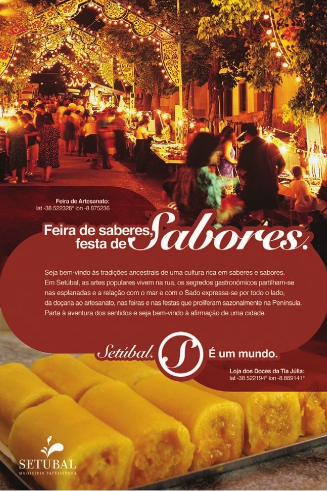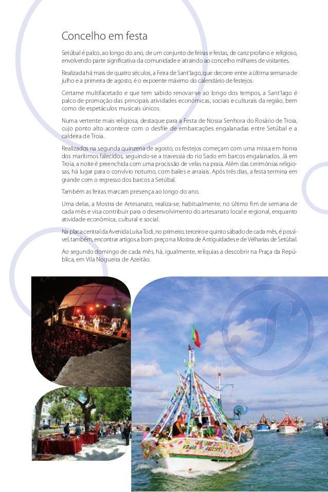 10. 10. Concelho em festa Setúbal é palco, ao longo do ano, de um conjunto de feiras e festas, de cariz profano e religioso, envolvendo parte significativa da comunidade e atraindo ao concelho milhares de visitantes. Realizada há mais de quatro séculos, a Feira de Sant’Iago, que decorre entre a última semana de julho e a primeira de agosto, é o expoente máximo do calendário de festejos. Certame multifacetado e que tem sabido renovar-se ao longo dos tempos, a Sant’Iago é palco de promoção das principais atividades económicas, sociais e culturais da região, bem como de espetáculos musicais únicos. Numa vertente mais religiosa, destaque para a Festa de Nossa Senhora do Rosário de Troia, cujo ponto alto acontece com o desfile de embarcações engalanadas entre Setúbal e a caldeira de Troia. Realizados na segunda quinzena de agosto, os festejos começam com uma missa em honra dos marítimos falecidos, seguindo-se a travessia do rio Sado em barcos engalanados. Já em Troia, a noite é preenchida com uma procissão de velas na praia. Além das cerimónias religiosas, há lugar para o convívio noturno, com bailes e arraiais. Após três dias, a festa termina em grande com o regresso dos barcos a Setúbal. Também as feiras marcam presença ao longo do ano. Uma delas, a Mostra de Artesanato, realiza-se, habitualmente, no último fim de semana de cada mês e visa contribuir para o desenvolvimento do artesanato local e regional, enquanto atividade económica, cultural e social. possí Na placa central da Avenida Luísa Todi, no primeiro, terceiro e quinto sábado de cada mês, é possível, também, encontrar artigos a bom preço na Mostra de Antiguidades e de Velharias de Setúbal. Repú Ao segundo domingo de cada mês, há, igualmente, relíquias a descobrir na Praça da República, em Vila Nogueira de Azeitão.