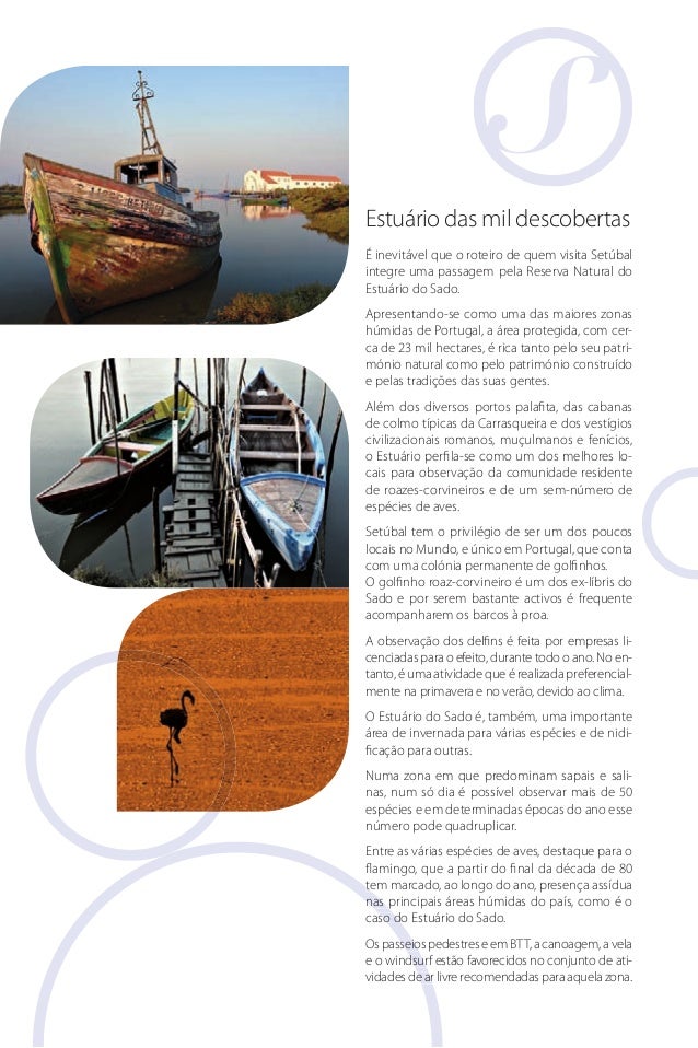 13. 13. Estuário das mil descobertas É inevitável que o roteiro de quem visita Setúbal integre uma passagem pela Reserva Natural do Estuário do Sado. Apresentando-se como uma das maiores zonas húmidas de Portugal, a área protegida, com cerca de 23 mil hectares, é rica tanto pelo seu património natural como pelo património construído e pelas tradições das suas gentes. Além dos diversos portos palafita, das cabanas de colmo típicas da Carrasqueira e dos vestígios civilizacionais romanos, muçulmanos e fenícios, o Estuário perfila-se como um dos melhores locais para observação da comunidade residente de roazes-corvineiros e de um sem-número de espécies de aves. Setúbal tem o privilégio de ser um dos poucos locais no Mundo, e único em Portugal, que conta com uma colónia permanente de golfinhos. O golfinho roaz-corvineiro é um dos ex-líbris do Sado e por serem bastante activos é frequente acompanharem os barcos à proa. A observação dos delfins é feita por empresas licenciadas para o efeito, durante todo o ano. No entanto, é uma atividade que é realizada preferencialmente na primavera e no verão, devido ao clima. O Estuário do Sado é, também, uma importante área de invernada para várias espécies e de nidificação para outras. Numa zona em que predominam sapais e salinas, num só dia é possível observar mais de 50 espécies e em determinadas épocas do ano esse número pode quadruplicar. Entre as várias espécies de aves, destaque para o flamingo, que a partir do final da década de 80 tem marcado, ao longo do ano, presença assídua nas principais áreas húmidas do país, como é o caso do Estuário do Sado. Os passeios pedestres e em BTT, a canoagem, a vela ati e o windsurf estão favorecidos no conjunto de atividades de ar livre recomendadas para aquela zona.