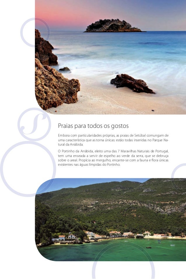 3. 3. Praias para todos os gostos Embora com particularidades próprias, as praias de Setúbal comungam de uma característica que as torna únicas: estão todas inseridas no Parque Natural da Arrábida. O Portinho da Arrábida, eleito uma das 7 Maravilhas Naturais de Portugal, tem uma enseada a servir de espelho ao verde da serra, que se debruça sobre o areal. Propícia ao mergulho, encante-se com a fauna e flora únicas existentes nas águas límpidas do Portinho.