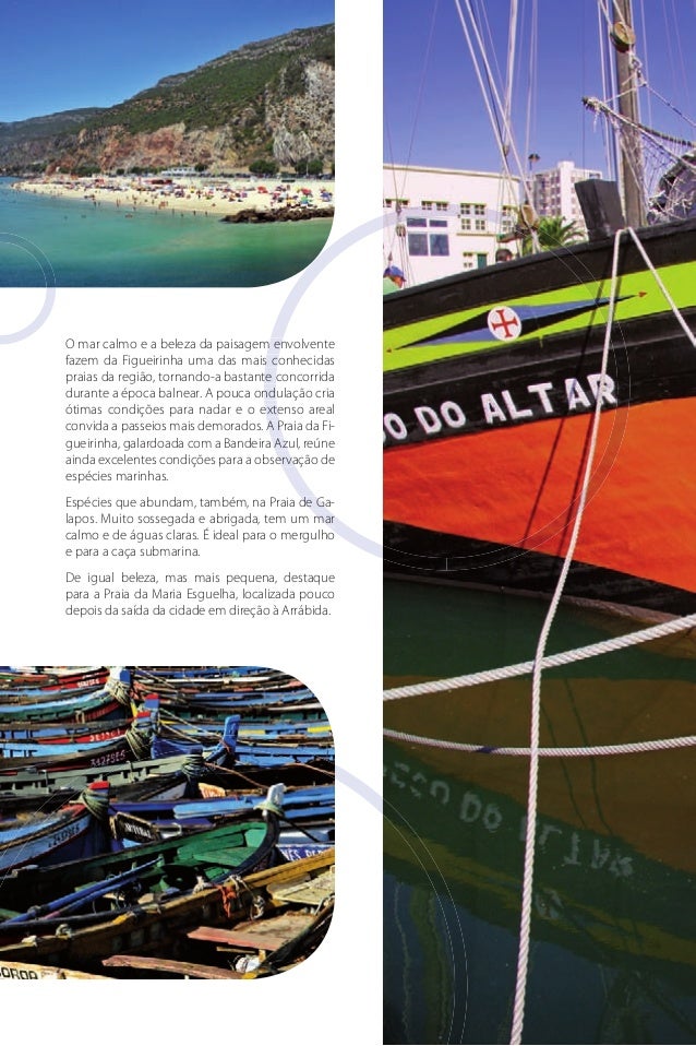 4. 4. O mar calmo e a beleza da paisagem envolvente fazem da Figueirinha uma das mais conhecidas praias da região, tornando-a bastante concorrida durante a época balnear. A pouca ondulação cria ótimas condições para nadar e o extenso areal convida a passeios mais demorados. A Praia da FiFi gueirinha, galardoada com a Bandeira Azul, reúne ainda excelentes condições para a observação de espécies marinhas. Ga Espécies que abundam, também, na Praia de Galapos. Muito sossegada e abrigada, tem um mar calmo e de águas claras. É ideal para o mergulho e para a caça submarina. De igual beleza, mas mais pequena, destaque para a Praia da Maria Esguelha, localizada pouco depois da saída da cidade em direção à Arrábida.