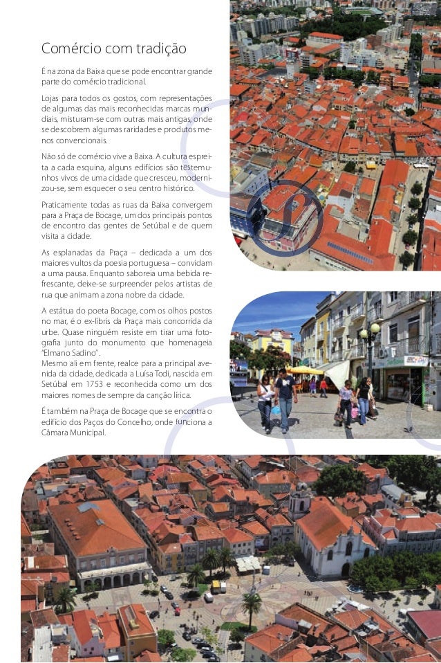 6. 6. Comércio com tradição É na zona da Baixa que se pode encontrar grande parte do comércio tradicional. Lojas para todos os gostos, com representações de algumas das mais reconhecidas marcas mundiais, misturam-se com outras mais antigas, onde me se descobrem algumas raridades e produtos menos convencionais. esprei Não só de comércio vive a Baixa. A cultura espreitestemu ta a cada esquina, alguns edifícios são testemumoderni nhos vivos de uma cidade que cresceu, modernizou-se, sem esquecer o seu centro histórico. Praticamente todas as ruas da Baixa convergem para a Praça de Bocage, um dos principais pontos de encontro das gentes de Setúbal e de quem visita a cidade. As esplanadas da Praça – dedicada a um dos maiores vultos da poesia portuguesa – convidam a uma pausa. Enquanto saboreia uma bebida refrescante, deixe-se surpreender pelos artistas de rua que animam a zona nobre da cidade. A estátua do poeta Bocage, com os olhos postos no mar, é o ex-líbris da Praça mais concorrida da urbe. Quase ninguém resiste em tirar uma fotografia junto do monumento que homenageia “Elmano Sadino” . Mesmo ali em frente, realce para a principal avenida da cidade, dedicada a Luísa Todi, nascida em Setúbal em 1753 e reconhecida como um dos maiores nomes de sempre da canção lírica. É também na Praça de Bocage que se encontra o edifício dos Paços do Concelho, onde funciona a Câmara Municipal.
