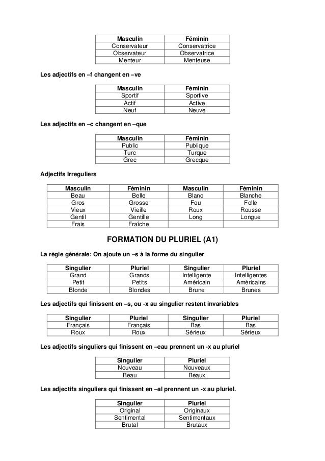 2. 2. Masculin Féminin Conservateur Conservatrice Observateur Observatrice Menteur MenteuseLes adjectifs en –f changent en –ve Masculin Féminin Sportif Sportive Actif Active Neuf NeuveLes adjectifs en –c changent en –que Masculin Féminin Public Publique Turc Turque Grec GrecqueAdjectifs Irreguliers Masculin Féminin Masculin Féminin Beau Belle Blanc Blanche Gros Grosse Fou Folle Vieux Vieille Roux Rousse Gentil Gentille Long Longue Frais Fraîche FORMATION DU PLURIEL (A1)La règle générale: On ajoute un –s à la forme du singulier Singulier Pluriel Singulier Pluriel Grand Grands Intelligente Intelligentes Petit Petits Américain Américains Blonde Blondes Brune BrunesLes adjectifs qui finissent en –s, ou -x au singulier restent invariables Singulier Pluriel Singulier Pluriel Français Français Bas Bas Roux Roux Sérieux SérieuxLes adjectifs singuliers qui finissent en –eau prennent un -x au pluriel Singulier Pluriel Nouveau Nouveaux Beau BeauxLes adjectifs singuliers qui finissent en –al prennent un -x au pluriel. Singulier Pluriel Original Originaux Sentimental Sentimentaux Brutal Brutaux