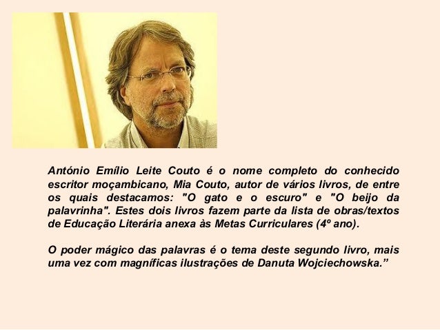 1. 1. António Emílio Leite Couto é o nome completo do conhecidoescritor moçambicano, Mia Couto, autor de vários livros, de entreos quais destacamos: "O gato e o escuro" e "O beijo dapalavrinha". Estes dois livros fazem parte da lista de obras/textosde Educação Literária anexa às Metas Curriculares (4º ano).O poder mágico das palavras é o tema deste segundo livro, maisuma vez com magníficas ilustrações de Danuta Wojciechowska.”