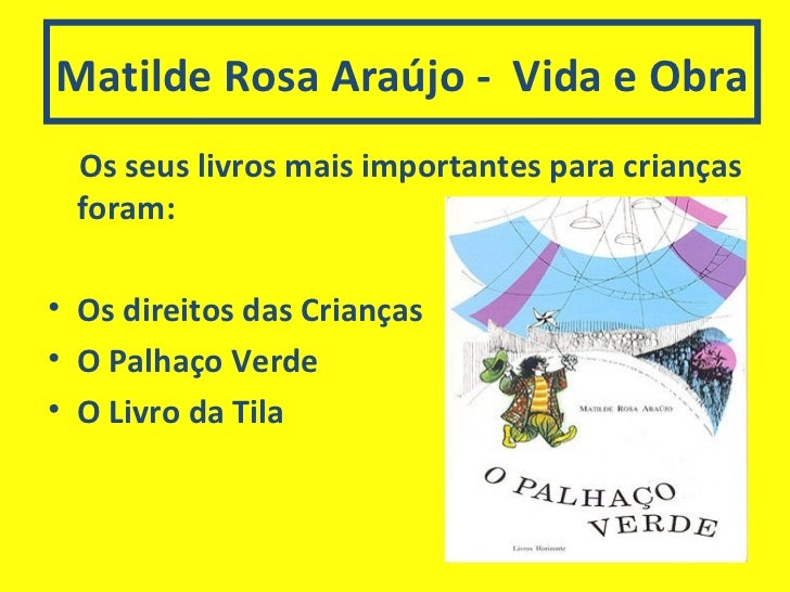 10. 10. Matilde Rosa Araújo - Vida e Obra <ul><li>Os seus livros mais importantes para crianças foram: </li></ul><ul><li>Os direitos das Crianças </li></ul><ul><li>O Palhaço Verde </li></ul><ul><li>O Livro da Tila </li></ul>
