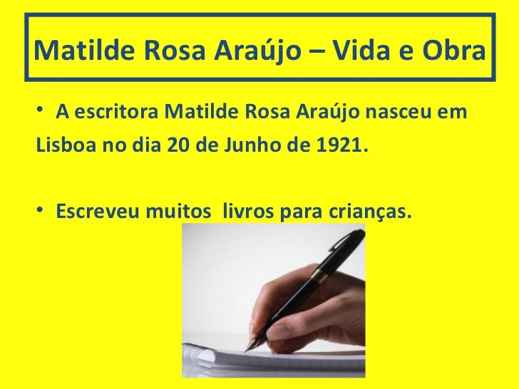 2. 2. Matilde Rosa Araújo – Vida e Obra <ul><li>A escritora Matilde Rosa Araújo nasceu em </li></ul><ul><li>Lisboa no dia 20 de Junho de 1921. </li></ul><ul><li>Escreveu muitos livros para crianças. </li></ul>