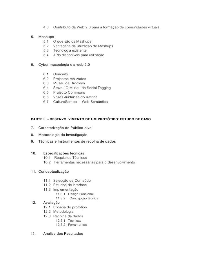 2. 2. 4.3 Contributo da Web 2.0 para a formação de comunidades virtuais. 5. Mashups 5.1 O que são os Mashups 5.2 Vantagens da utilização de Mashups 5.3 Tecnologia existente 5.4 APIs disponíveis para utilização 6. Cyber museologia e a web 2.0 6.1 Conceito 6.2 Projectos realizados 6.3 Museu de Brooklyn 6.4 Steve: O Museu de Social Tagging 6.5 Projecto Commons 6.6 Vozes Juidaicas do Katrina 6.7 CultureSampo – Web Semântica PARTE II - DESENVOLVIMENTO DE UM PROTÓTIPO: ESTUDO DE CASO 7. Caracterização do Público-alvo 8. Metodologia de Investigação 9. Técnicas e Instrumentos de recolha de dados 10. Especificações técnicas 10.1 Requisitos Técnicos 10.2 Ferramentas necessárias para o desenvolvimento 11. Conceptualização 11.1 Selecção de Conteúdo 11.2 Estudos de interface 11.3 Implementação 11.3.1 Design Funcional 11.3.2 Concepção técnica 12. Avaliação 12.1 Eficácia do protótipo 12.2 Metodologia 12.3 Recolha de dados 12.3.1 Técnicas 12.3.2 Ferramentas 13. Análise dos Resultados