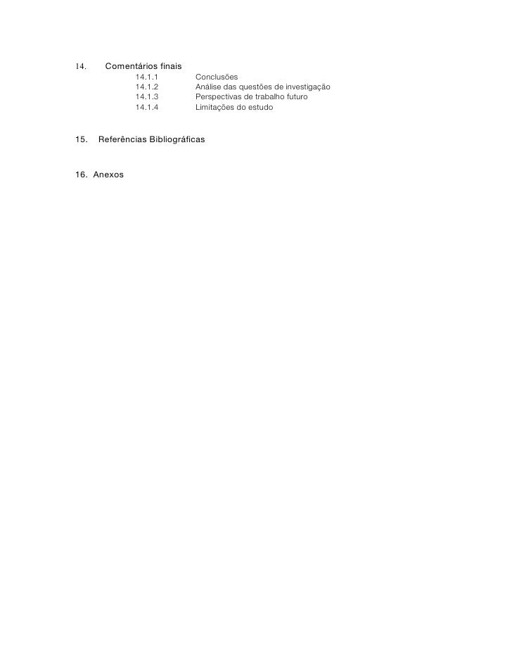 3. 3. 14. Comentários finais 14.1.1 Conclusões 14.1.2 Análise das questões de investigação 14.1.3 Perspectivas de trabalho futuro 14.1.4 Limitações do estudo 15. Referências Bibliográficas 16. Anexos