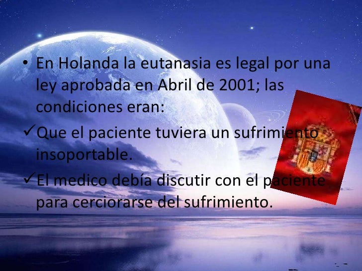 11. 11. • En Holanda la eutanasia es legal por una ley aprobada en Abril de 2001; las condiciones eran:Que el paciente tuviera un sufrimiento insoportable.El medico debía discutir con el paciente para cerciorarse del sufrimiento.