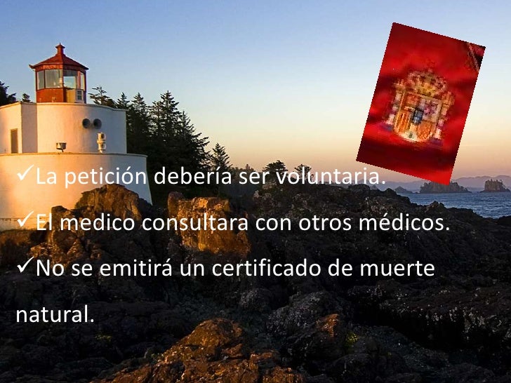 12. 12. La petición debería ser voluntaria.El medico consultara con otros médicos.No se emitirá un certificado de muertenatural.
