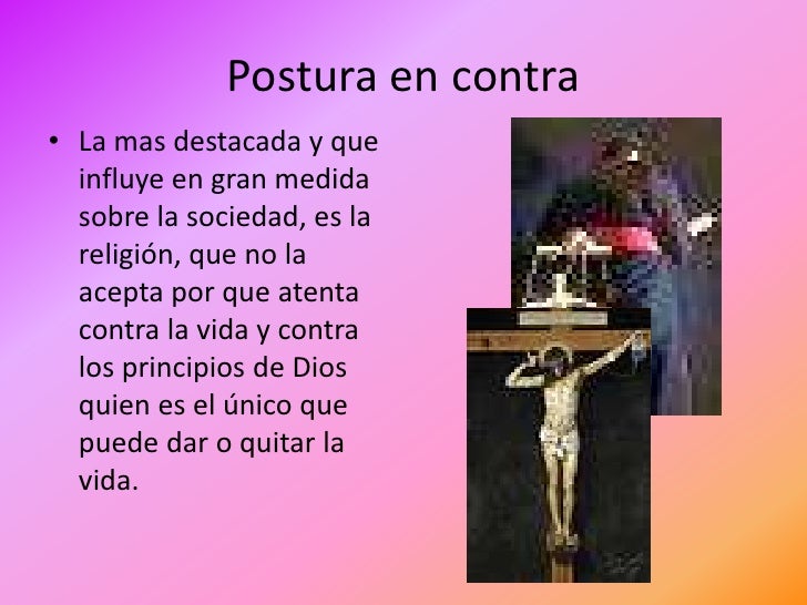 15. 15. Postura en contra• La mas destacada y que influye en gran medida sobre la sociedad, es la religión, que no la acepta por que atenta contra la vida y contra los principios de Dios quien es el único que puede dar o quitar la vida.