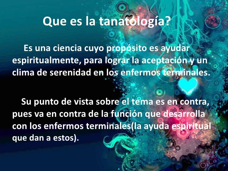 16. 16. Que es la tanatología? Es una ciencia cuyo propósito es ayudarespiritualmente, para lograr la aceptación y unclima de serenidad en los enfermos terminales. Su punto de vista sobre el tema es en contra,pues va en contra de la función que desarrollacon los enfermos terminales(la ayuda espiritualque dan a estos).