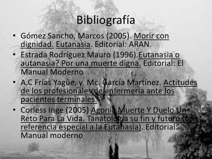 17. 17. Bibliografía• Gómez Sancho, Marcos (2005). Morir con dignidad. Eutanasia. Editorial: ARAN.• Estrada Rodríguez Mauro (1996).Eutanasia o autanasia? Por una muerte digna. Editorial: El Manual Moderno• A.C Frías Yagüe, y Mc. García Martínez. Actitudes de los profesionales de enfermería ante los pacientes terminales.• Corless Inge (2005) Agonía Muerte Y Duelo Un Reto Para La Vida. Tanatología su fin y futuro (con referencia especial a la Eutanasia). Editorial: Manual moderno