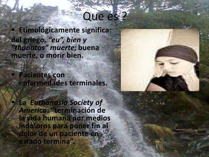 2. 2. Que es ? Etimológicamente significa:del griego, “eu”, bien y“thánatos” muerte; buenamuerte, o morir bien. Pacientes con enfermedades terminales. La Euthanasia Society of America: “terminación de la vida humana por medios indoloros para poner fin al dolor de un paciente en estado termina”.