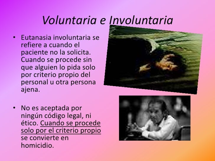 5. 5. Voluntaria e Involuntaria• Para comprender la eutanasia tenemos que entender que debe ser solicitada voluntariamente.