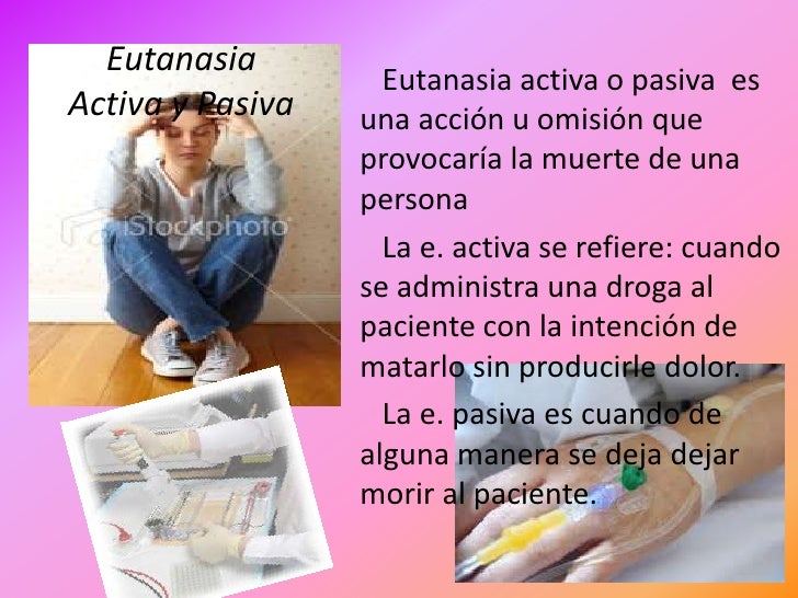 6. 6. Eutanasia Eutanasia activa o pasiva esActiva y Pasiva una acción u omisión que provocaría la muerte de una persona La e. activa se refiere: cuando se administra una droga al paciente con la intención de matarlo sin producirle dolor. La e. pasiva es cuando de alguna manera se deja dejar morir al paciente.