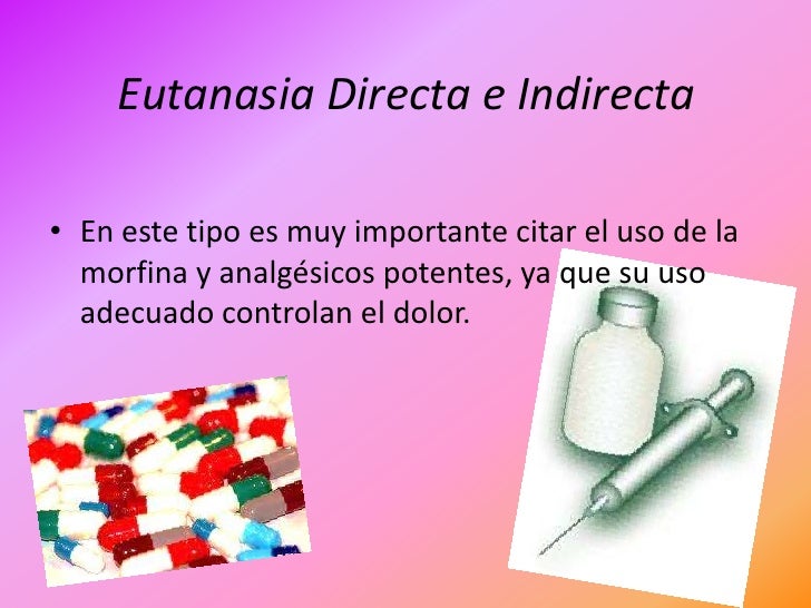 7. 7. Eutanasia Directa e Indirecta• En este tipo es muy importante citar el uso de la morfina y analgésicos potentes, ya que su uso adecuado controlan el dolor.