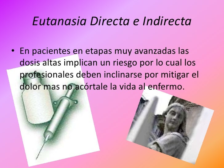 8. 8. Eutanasia Directa e Indirecta• En pacientes en etapas muy avanzadas las dosis altas implican un riesgo por lo cual los profesionales deben inclinarse por mitigar el dolor mas no acórtale la vida al enfermo.