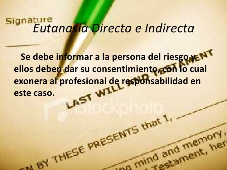 9. 9. Eutanasia Directa e Indirecta Se debe informar a la persona del riesgo yellos deben dar su consentimiento, con lo cualexonera al profesional de responsabilidad eneste caso.