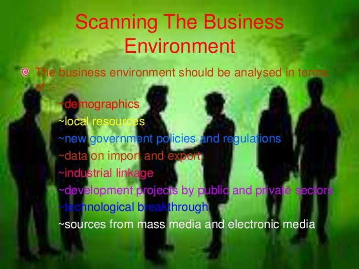 11. 11. Scanning The Business EnvironmentThe business environment should be analysed in termsof :- ~demographics ~local resources ~new government policies and regulations ~data on import and export ~industrial linkage ~development projects by public and private sectors ~technological breakthrough ~sources from mass media and electronic media