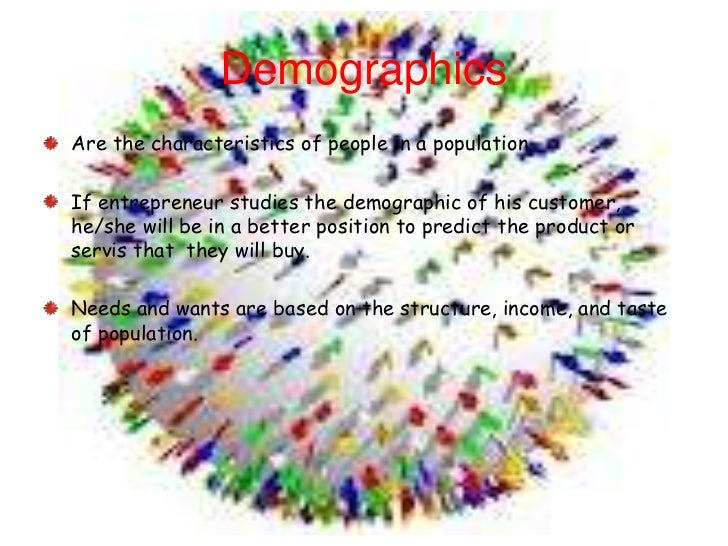 12. 12. DemographicsAre the characteristics of people in a population.If entrepreneur studies the demographic of his customer,he/she will be in a better position to predict the product orservis that they will buy.Needs and wants are based on the structure, income, and tasteof population.