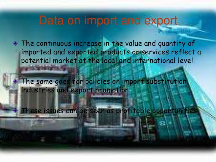 15. 15. Data on import and exportThe continuous increase in the value and quantity ofimported and exported products or services reflect apotential market at the local and international level.The same goes for policies on import substitutionindustries and export promotionThese issues can be seen as profitable opportunities.