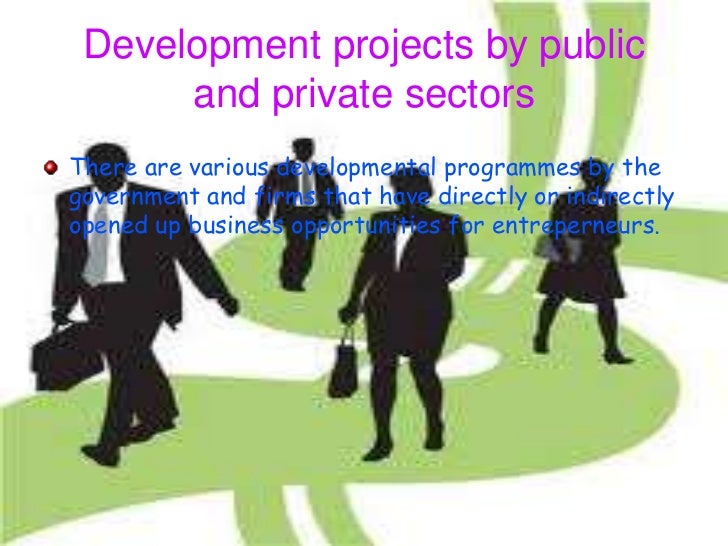 17. 17. Development projects by public and private sectorsThere are various developmental programmes by thegovernment and firms that have directly or indirectlyopened up business opportunities for entreperneurs.