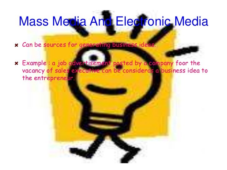 19. 19. Mass Media And Electronic MediaCan be sources for generating business ideas.Example : a job advertisement posted by a company foor thevacancy of sales executive can be consideras a business idea tothe entrepreneur.