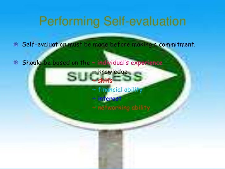 20. 20. Performing Self-evaluationSelf-evaluation must be made before making a commitment.Should be based on the ~ individual’s experience ~ knowledge ~ skills ~ financial ability ~ interest ~ networking ability