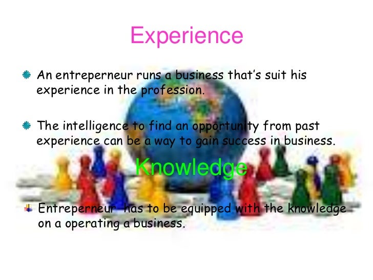 21. 21. ExperienceAn entreperneur runs a business that’s suit hisexperience in the profession.The intelligence to find an opportunity from pastexperience can be a way to gain success in business. KnowledgeEntreperneur has to be equipped with the knowledgeon a operating a business.