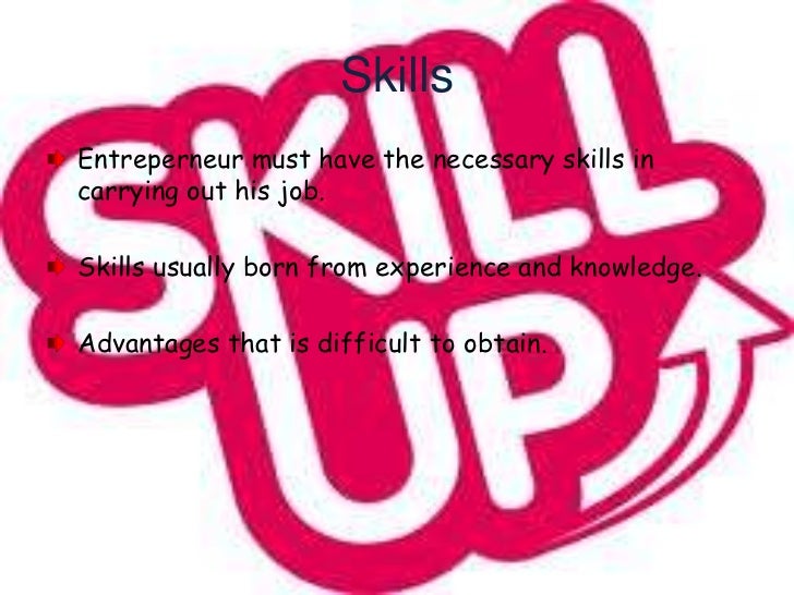 22. 22. SkillsEntreperneur must have the necessary skills incarrying out his job.Skills usually born from experience and knowledge.Advantages that is difficult to obtain.