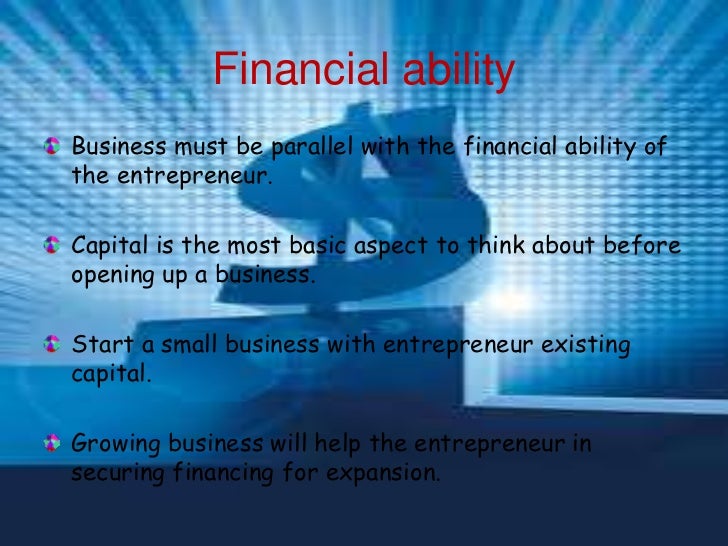 23. 23. Financial abilityBusiness must be parallel with the financial ability ofthe entrepreneur.Capital is the most basic aspect to think about beforeopening up a business.Start a small business with entrepreneur existingcapital.Growing business will help the entrepreneur insecuring financing for expansion.