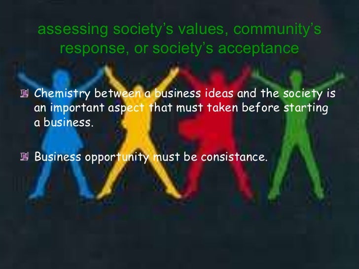 26. 26. assessing society’s values, community’s response, or society’s acceptanceChemistry between a business ideas and the society isan important aspect that must taken before startinga business.Business opportunity must be consistance.